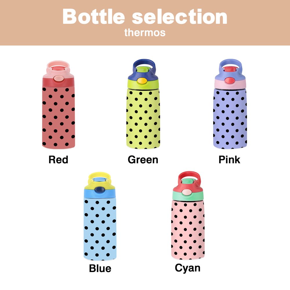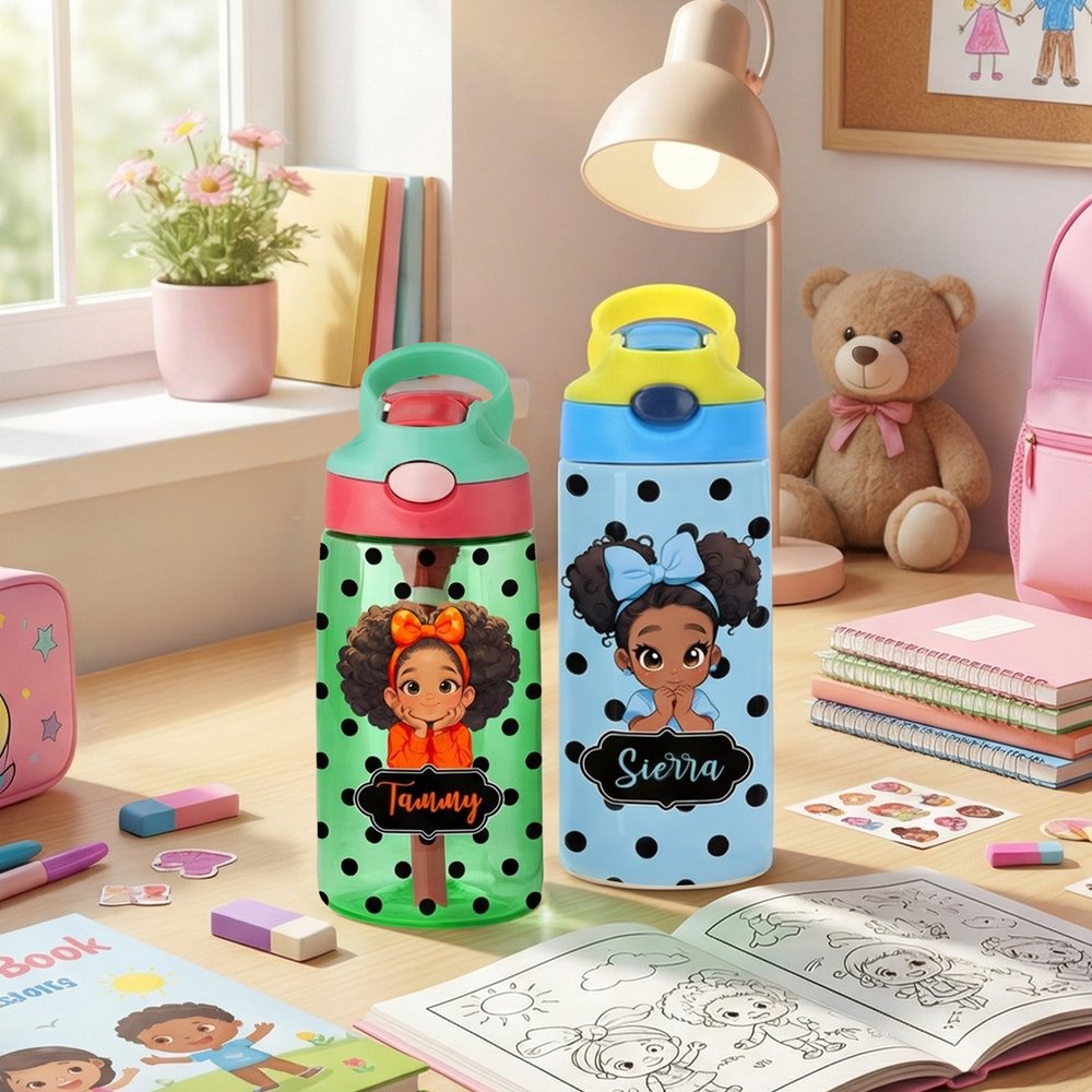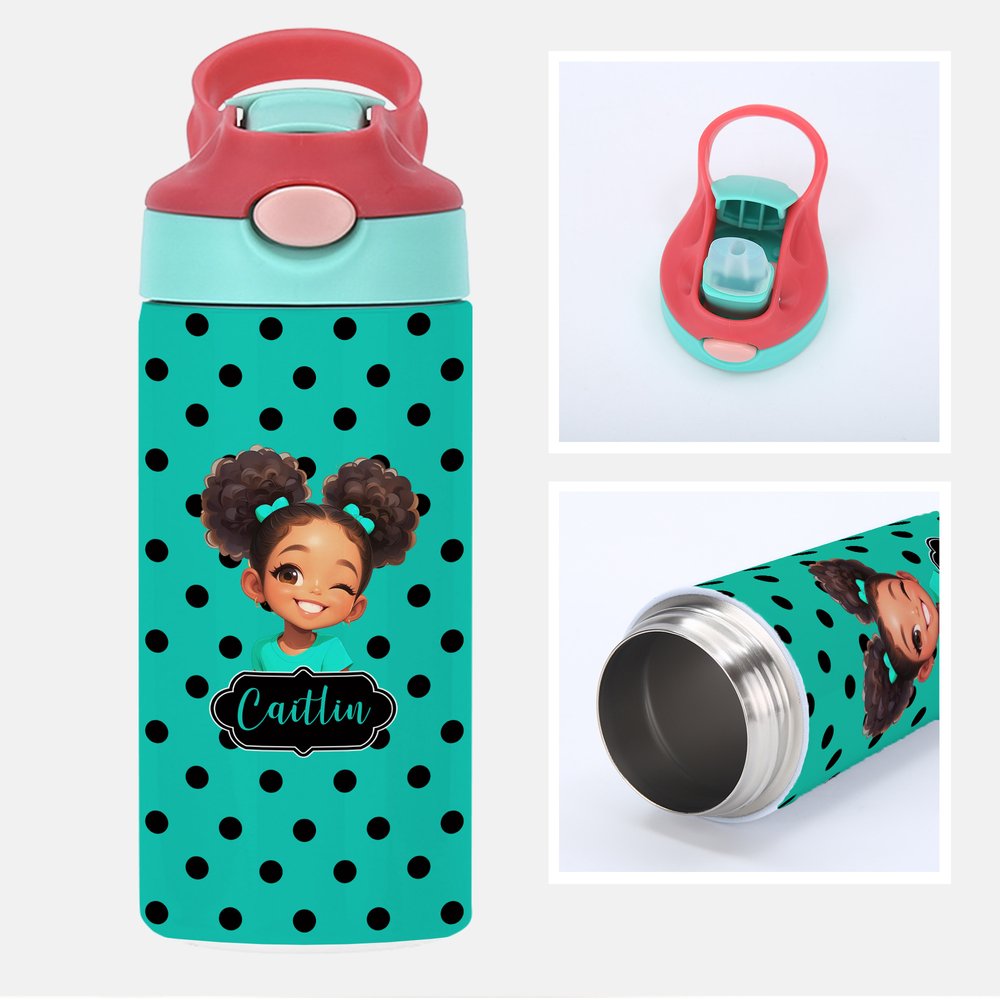 This water bottle features a delightful and playful design that showcases a charming cartoon Afro Black girl against a fun polka dot background. With the option to customize with your child's name, each bottle becomes a unique treasure that celebrates their individuality. Perfect for African American girls, this stylish water bottle combines functionality with a sense of pride, making it an essential accessory for school or play.