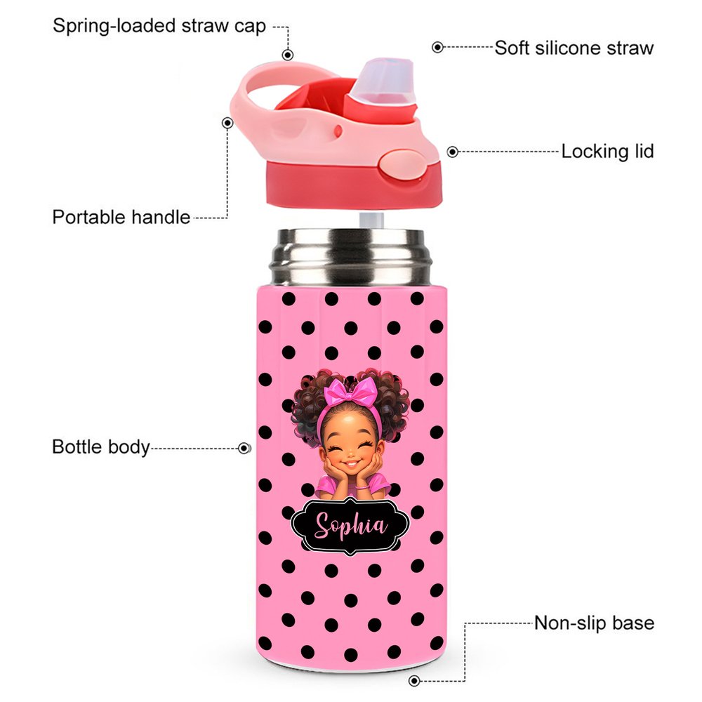 Custom Name Cartoon Afro Black Girl Polka Dots Water Bottle, 16oz Kids' Cup with Silicone Straw & Handle, Back to School/Birthday Gift for Girls