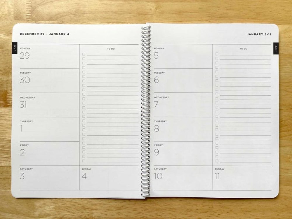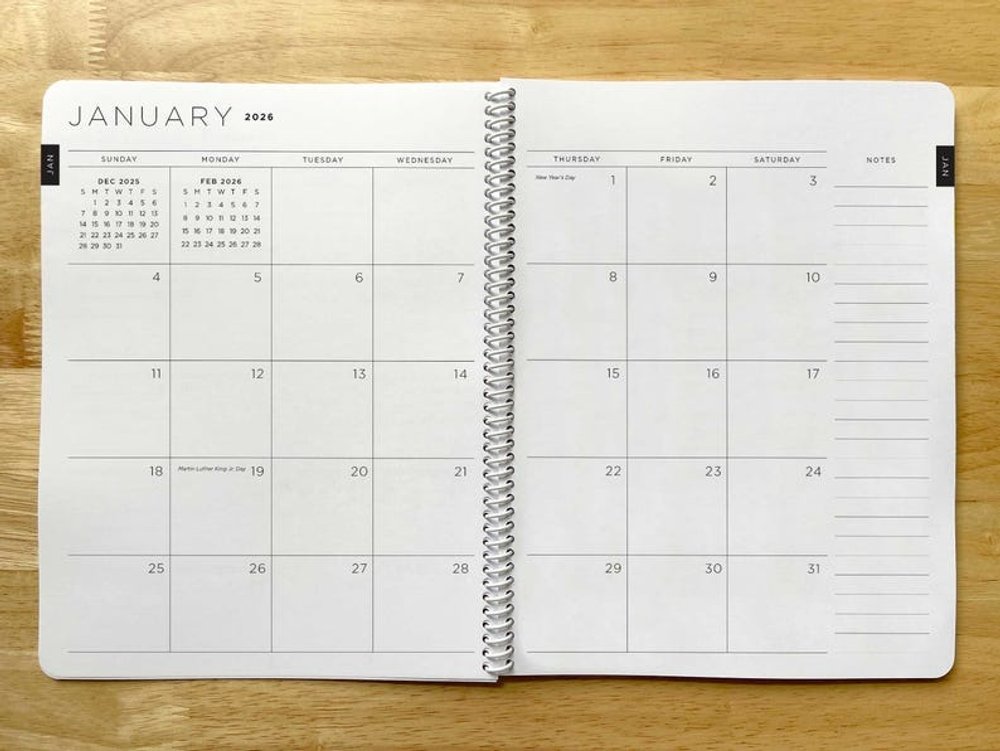Made with a durable white spiral binding and a soft-gloss laminated cardstock cover, this planner measures 8.5" x 11"âthe perfect letter size for desk or bag. Inside, youâll find 100 pages of 70# text-weight paper that resists ink bleed, including: 12 two-page monthly spreads with holidays marked 52 one-page weekly layouts for clear daily planning 1 personal name page for customization 21 note pages (1â2 after each month) for lists, ideas, or reflections All pages are printed with built-in floral-accented tabs for easy navigation.