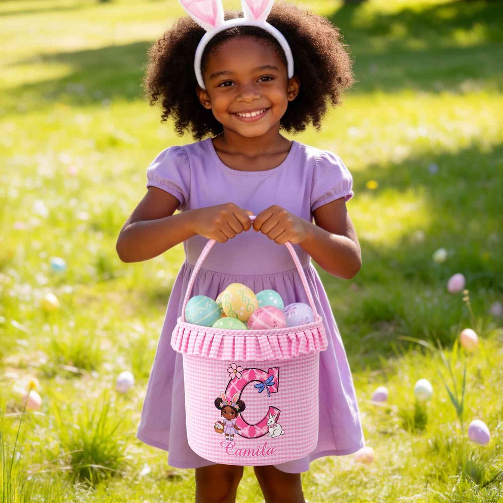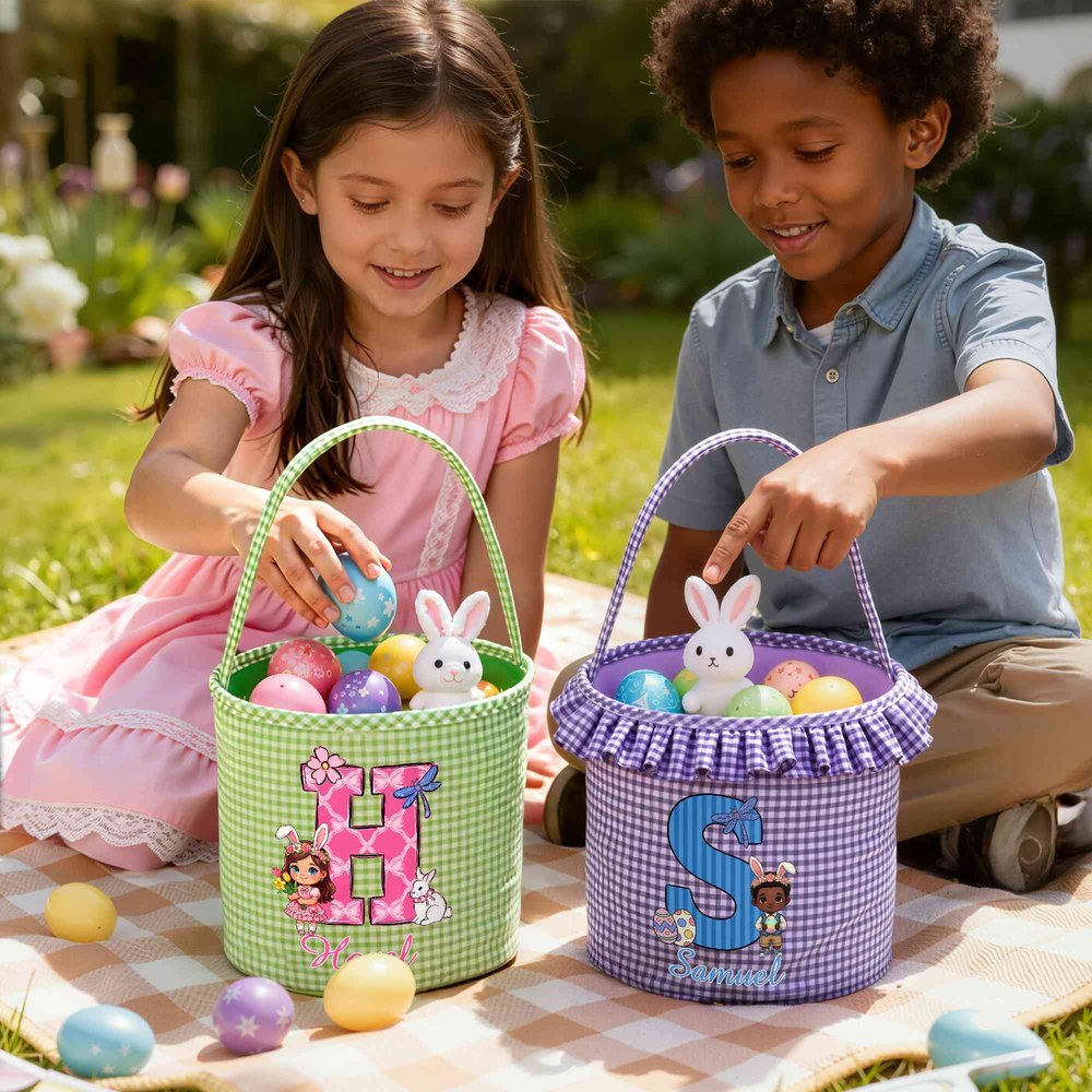 This basket perfectly blends adorable cartoon characters with customized initials, adorned with elements like flowers, dragonflies, and Easter eggs, creating a joyful and childlike Easter atmosphere. It supports customization of the child's initial and name, and features a plaid and ruffles design, making it a unique holiday symbol for your child.