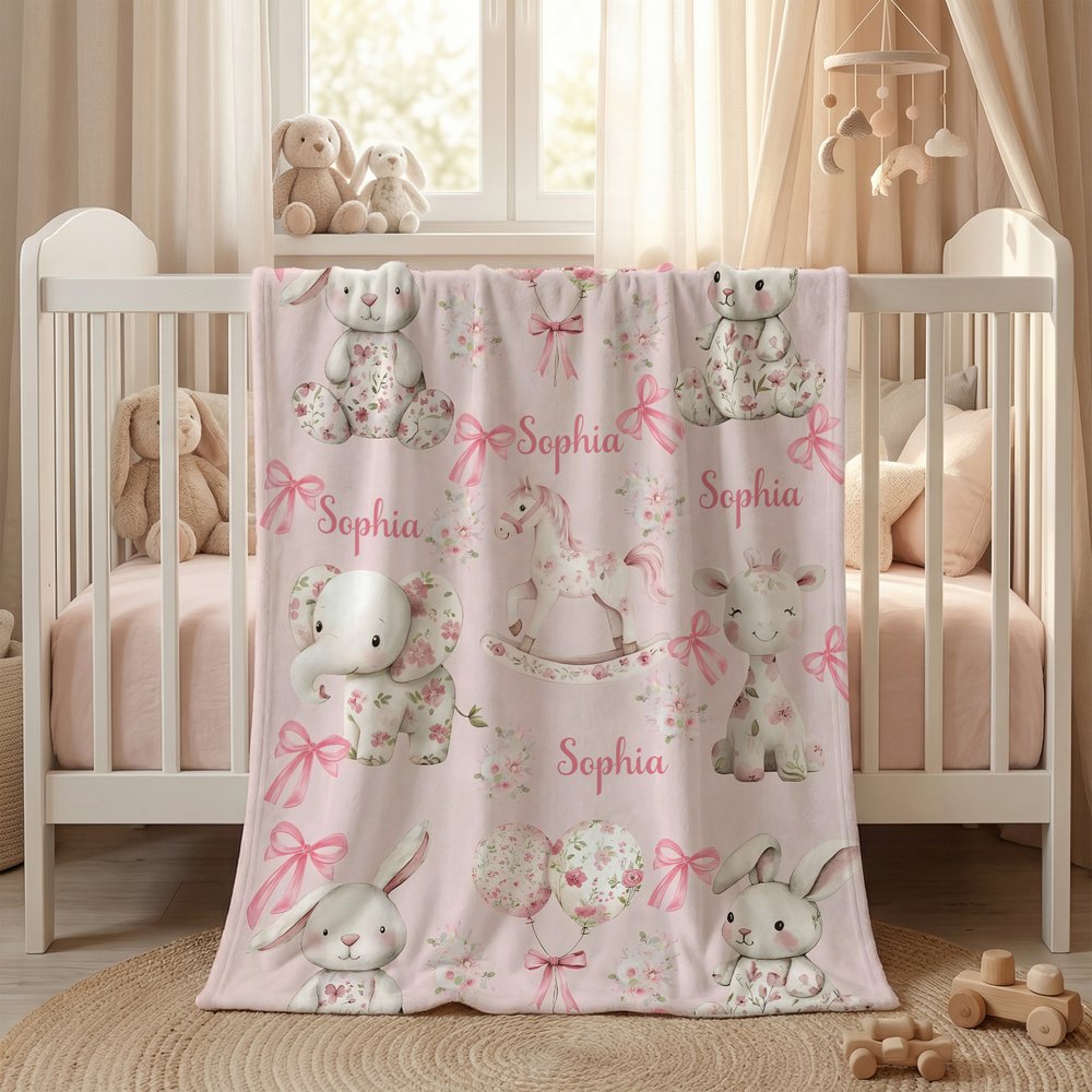 Snuggle up with our Personalized Floral Bow Animals Blanket! This adorable throw features cute bunnies, elephants, and giraffes amidst vibrant floral patterns, offering both warmth and charm for any child's room or nursery.